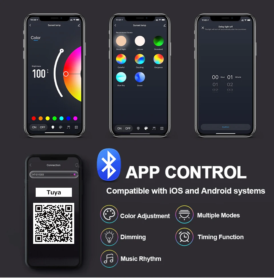 Ajuste cor, brilho, temporizador e efeitos de ritmo musical diretamente do seu celular via Bluetooth.